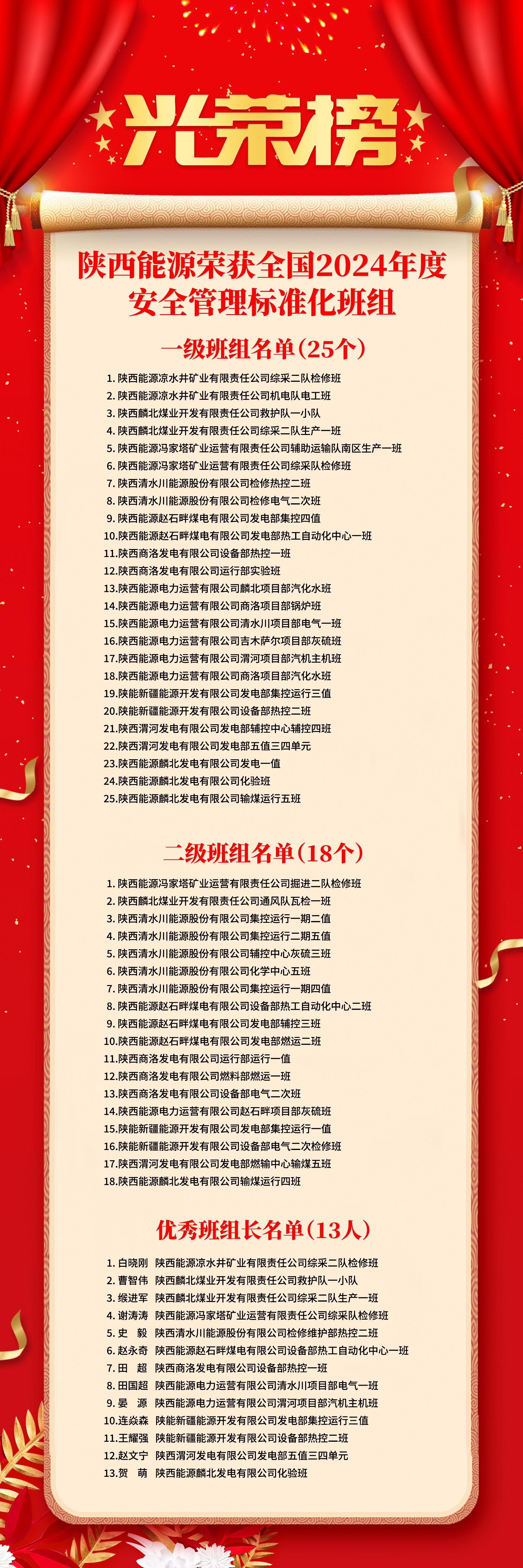 陕西能源全国2024年度安全管理标准化班组创建光荣榜
